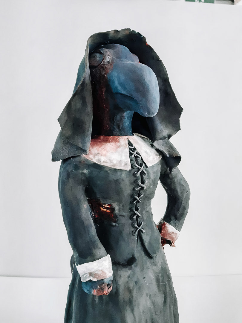 My Body of Work parallels historic human tragedies and animal extinction. Through the medium of clay, I have used satire and personification to cause the audience to ponder human tragedy and the growing loss of animal species. The monochromatic colour scheme presents the figurines as ghost-like, conveying a sense of the past. My ceramic works are deeply rooted in history, and that as humans, we do not always learn from the past.